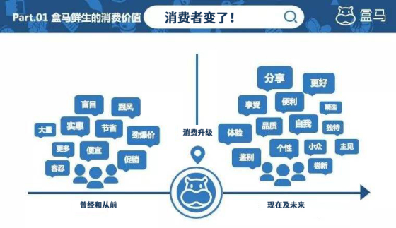 盒马鲜生以集“生鲜超市 + 餐饮体验 + 网上商务仓储配送”为一体的开拓性零售模式。 使广大消费者得到了全新的购物体验。盒马鲜生产品有鲜、海鲜、3r 产品(生食、熟食、半熟食)、无人看管货物(如使用全自动比萨机、全自动椰子机销售)等。盒马鲜生店餐厅区,消费者在店内选择海鲜等配料后也可以立即购买,烹饪后直接现场制作,店内将厨房提供给消费者。这种方法深受消费者欢迎,提高了商店客流转化率,带动了整个客流的高速增长。 除了可以支持中国消费者进行在线下门店内“逛吃”,盒马鲜生的线上体验也同样不凡。盒马鲜生通过企业电子价