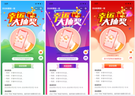 本周小程序新更新了两款游戏活动,摇一摇和水果机。现在商家越来越喜欢使用游戏进行营销活动,摇一摇、水果机游戏对于参与抽奖的用户而言更具有互动感和参与性。1、多种风格选择,支持活动背景图、活动音乐设置!2、奖品设置最多支持5个,奖品类型分为:实物奖励、互动积分、消费积分、消费红包、现金红包;实物奖励无需邮寄适合线下门店引流,现金红包分为发放到小程序余额或发放到会员微信零钱,消费红包只能用于购买商品等!3、参与限制:可参加的会员等级限制;必须消耗积分才能参与抽奖等限制4、可以设置总抽奖次数和每日抽奖次数等5、